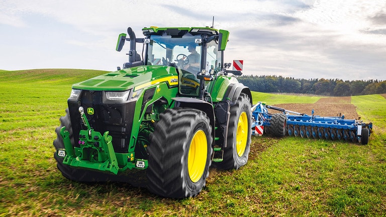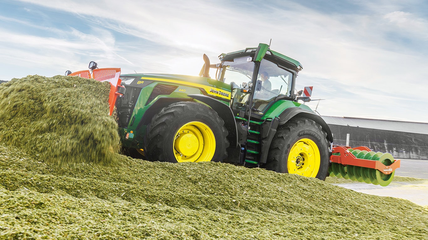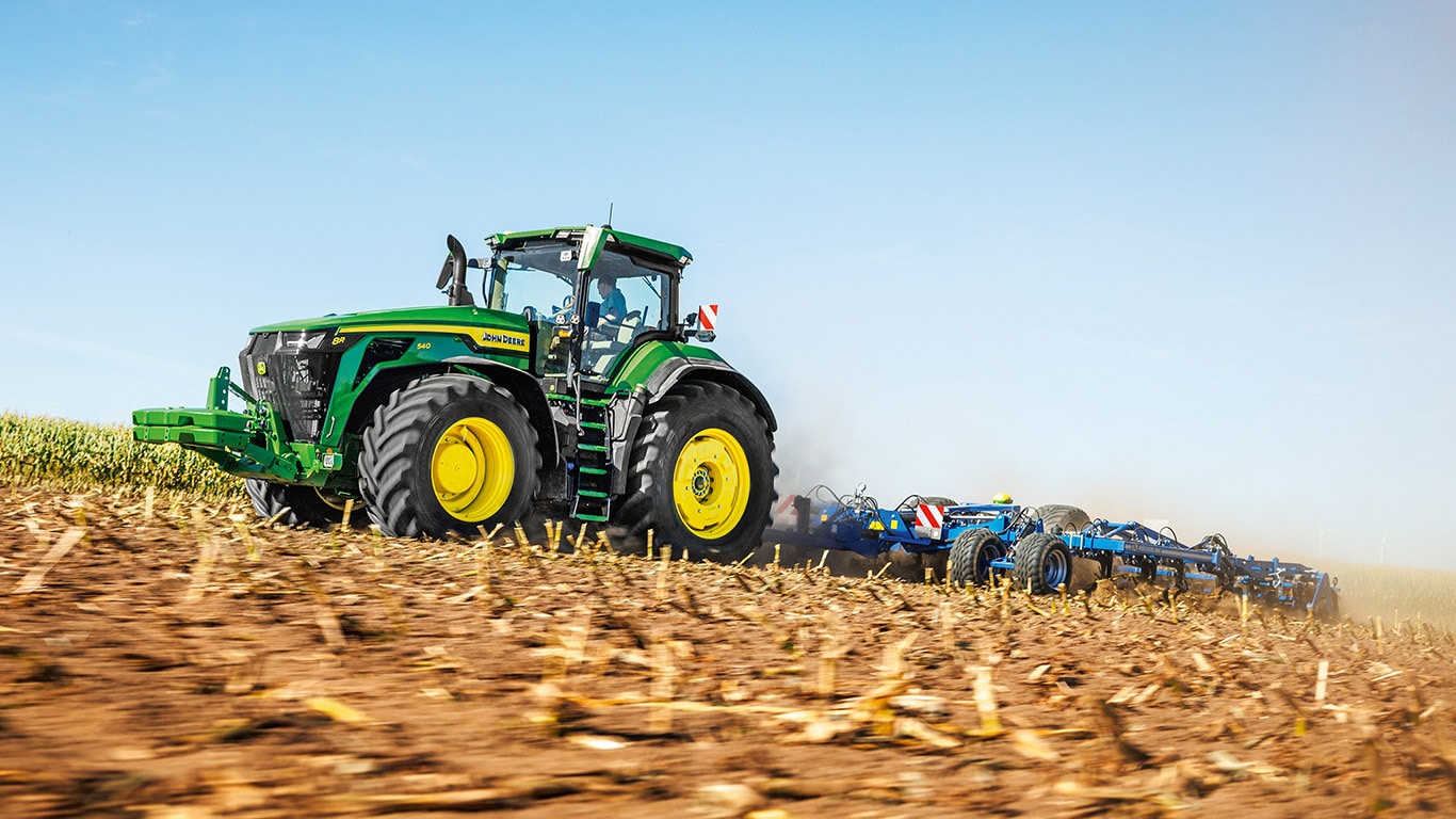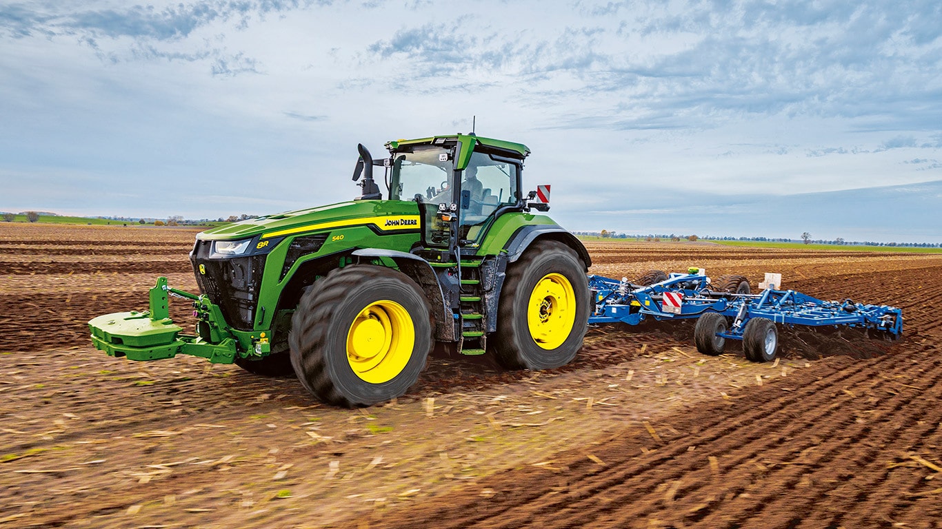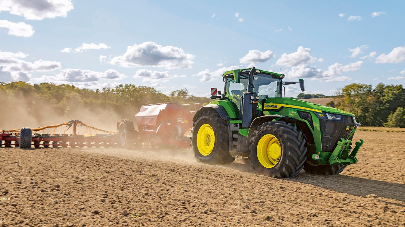 Az új 8R nagy teljesítményű traktorok biztosítják azt a vonóerőt, amelyre Önnek a legnehezebb munkagépekhez szüksége van. A csúcsteljesítményű IPM-mel a JD14 motor akár 634 LE teljesítményt is képes leadni pontosan akkor, amikor a maximális termelékenységhez bármilyen körülmények között szükség van rá. Az egyedülálló eAutoPowr™ fokozatmentes gyorsítást és akár 8%-kal jobb erőátvitelt biztosít a standard hidromechanikus fokozatmentes sebességváltókhoz képest*. Az új 8R nagy teljesítményű traktorok akár 2,30 m-es hátsó gumiabroncsokkal, akár 1,85 m-es első gumiabroncsokkal és egyvezetékes központi abroncsfelfújó rendszerrel vannak felszerelve a kiváló talajvédelem, erőátvitel és sokoldalúság érdekében.