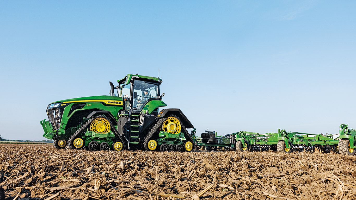 A 8RX nagy teljesítményű, egyedülálló négyhevederes járószerkezete kimagasló talajvédelmet és vonóerőt biztosít: Az akár 30"-os heveder szélességnek, a 30"-os hátsó hevederek esetén az alapfelszereltség részét képező szélesebb szabadonfutó kerekeknek és az új, csésze alakú nyomtávnak köszönhetően a 8RX a talajvédelem mércéje. A továbbfejlesztett járószerkezet kialakításának köszönhetően, amelyet most már a gumiheveder hajtóbordái és a gumihevederbe préselt futófelületek, valamint az új, ultra nagy molekulasúlyú (UHMW) köztes görgők alkotnak, amelyek tartós vas-műanyag kompozitból készülnek, és tartós kötéssel vannak ellátva, ezek a hevederek megmunkálatlan teljesítményt és megbízhatóságot nyújtanak a legnehezebb körülmények között is.