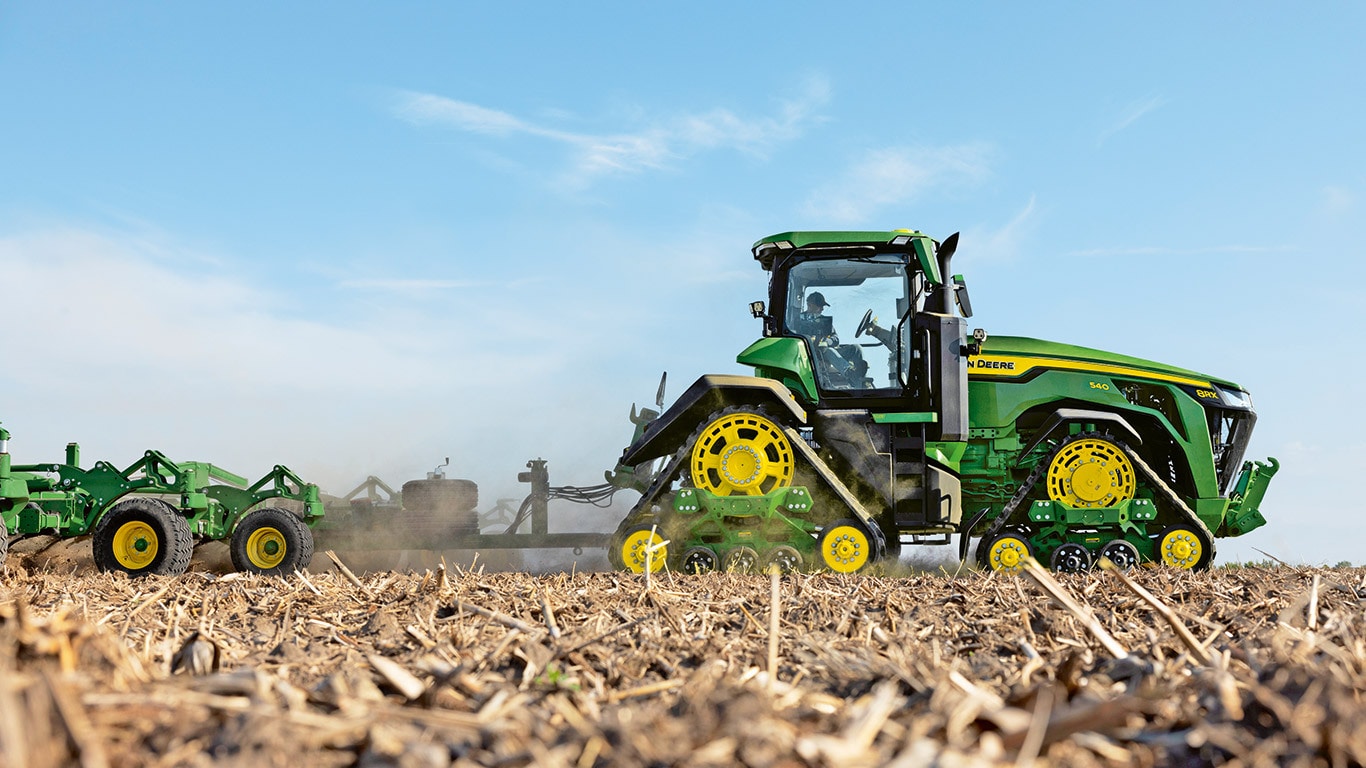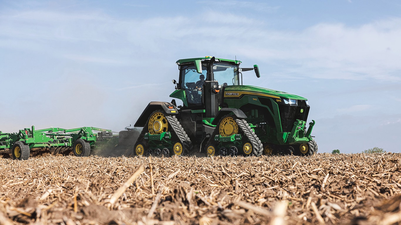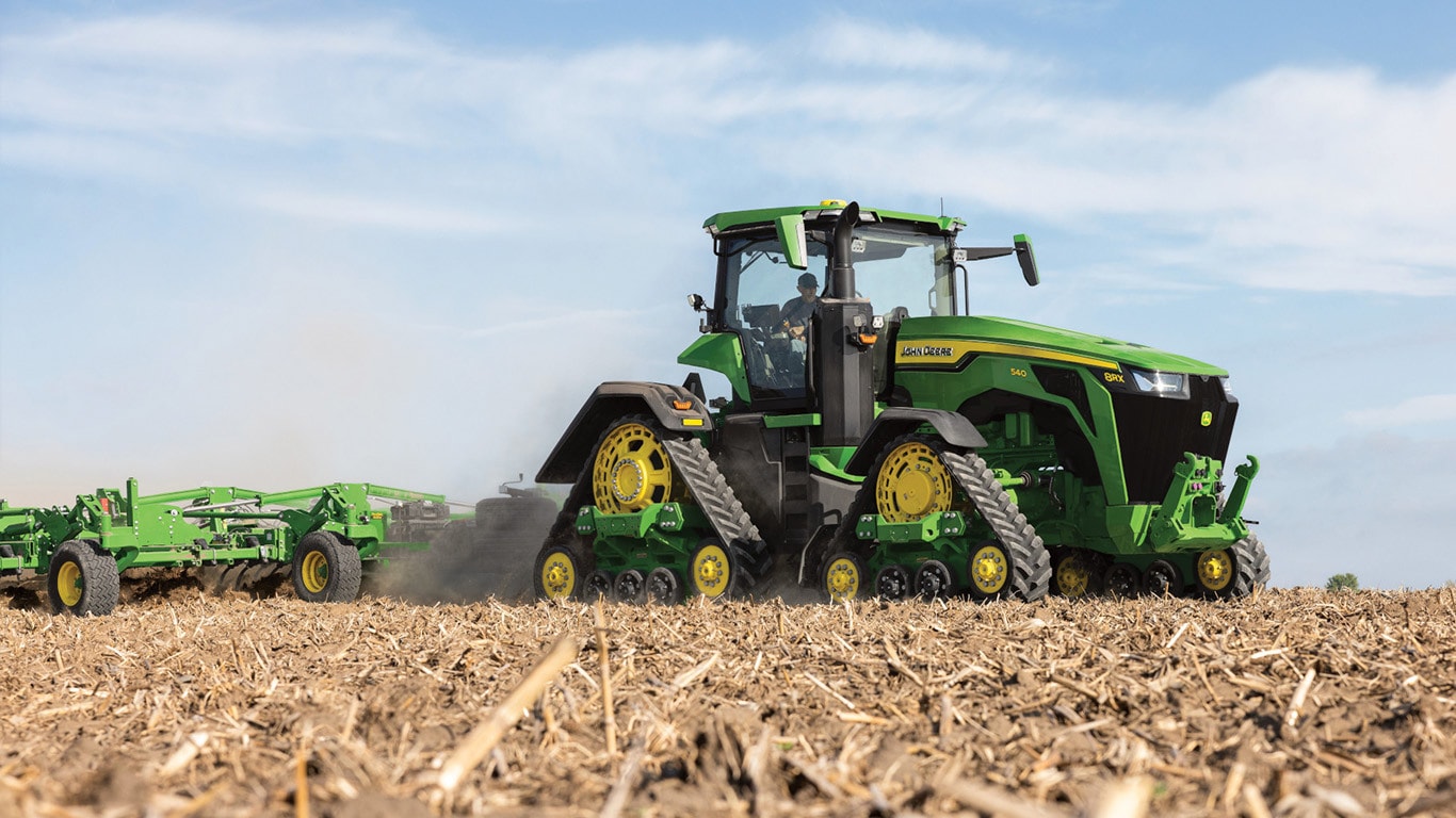 A 8RX nagy teljesítményű, egyedülálló négyhevederes járószerkezete kimagasló talajvédelmet és vonóerőt biztosít: Az akár 30"-os heveder szélességnek, a 30"-os hátsó hevederek esetén az alapfelszereltség részét képező szélesebb szabadonfutó kerekeknek és az új, csésze alakú nyomtávnak köszönhetően a 8RX a talajvédelem mércéje. A továbbfejlesztett járószerkezet kialakításának köszönhetően, amelyet most már a gumiheveder hajtóbordái és a gumihevederbe préselt futófelületek, valamint az új, ultra nagy molekulasúlyú (UHMW) köztes görgők alkotnak, amelyek tartós vas-műanyag kompozitból készülnek, és tartós kötéssel vannak ellátva, ezek a hevederek megmunkálatlan teljesítményt és megbízhatóságot nyújtanak a legnehezebb körülmények között is.